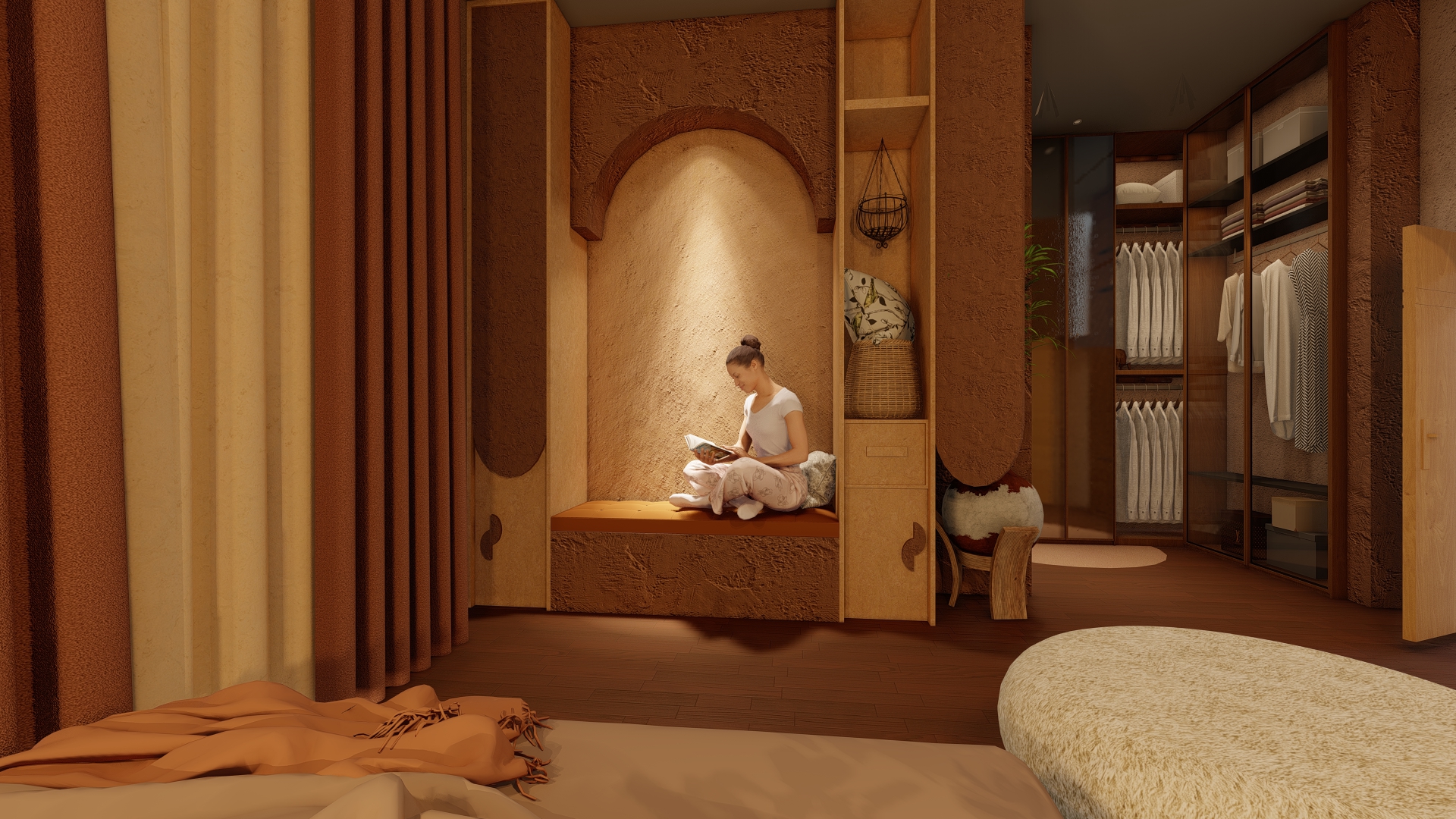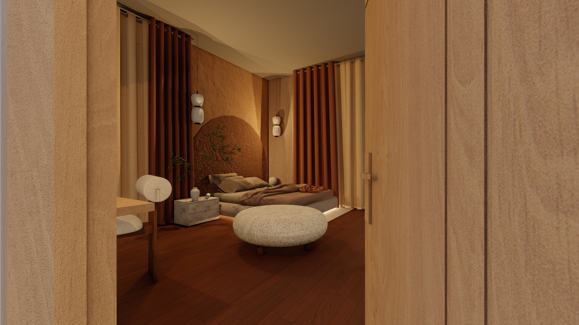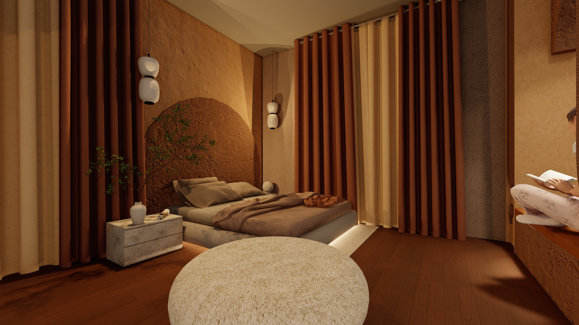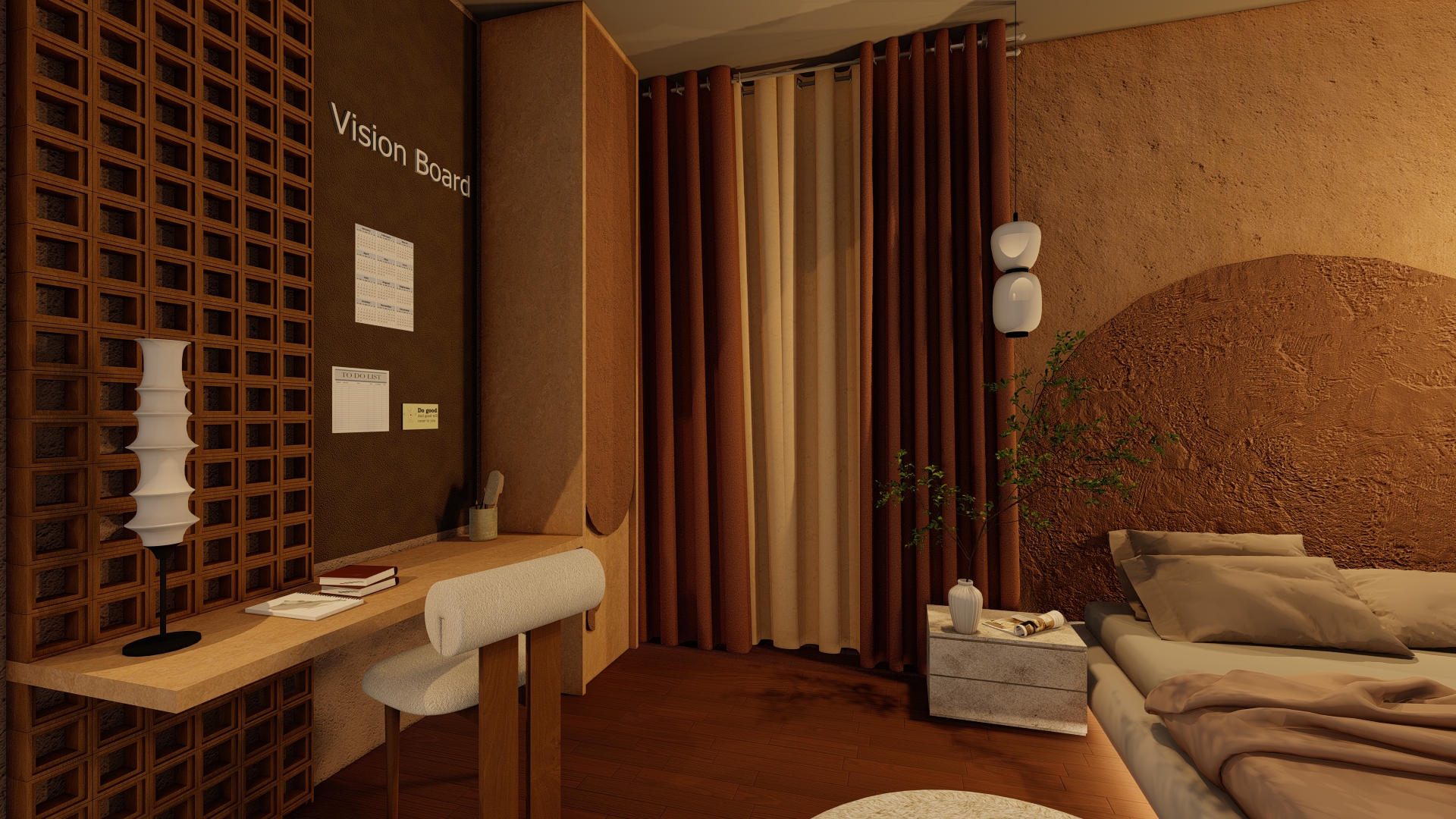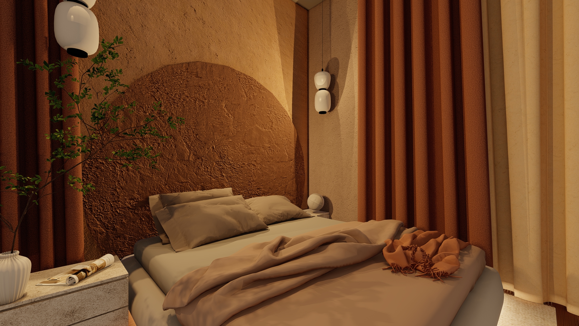Sunset Reverie is a serene bedroom design that captures the warmth and tranquility of a Mediterranean sunset. Drawing inspiration from the earthy hues of terracotta, this space transforms the bedroom into a cozy sanctuary, blending rustic charm with modern elegance.