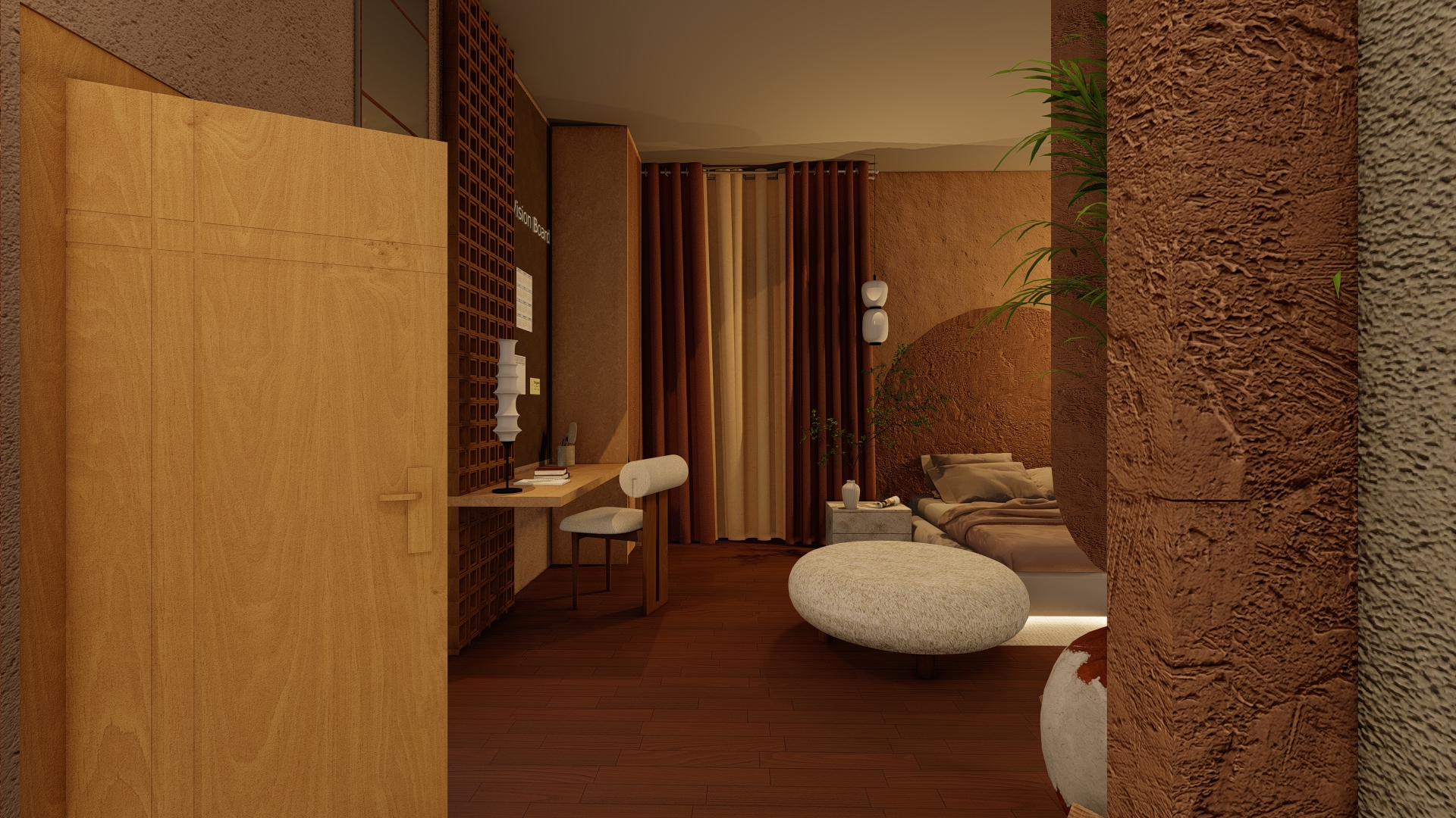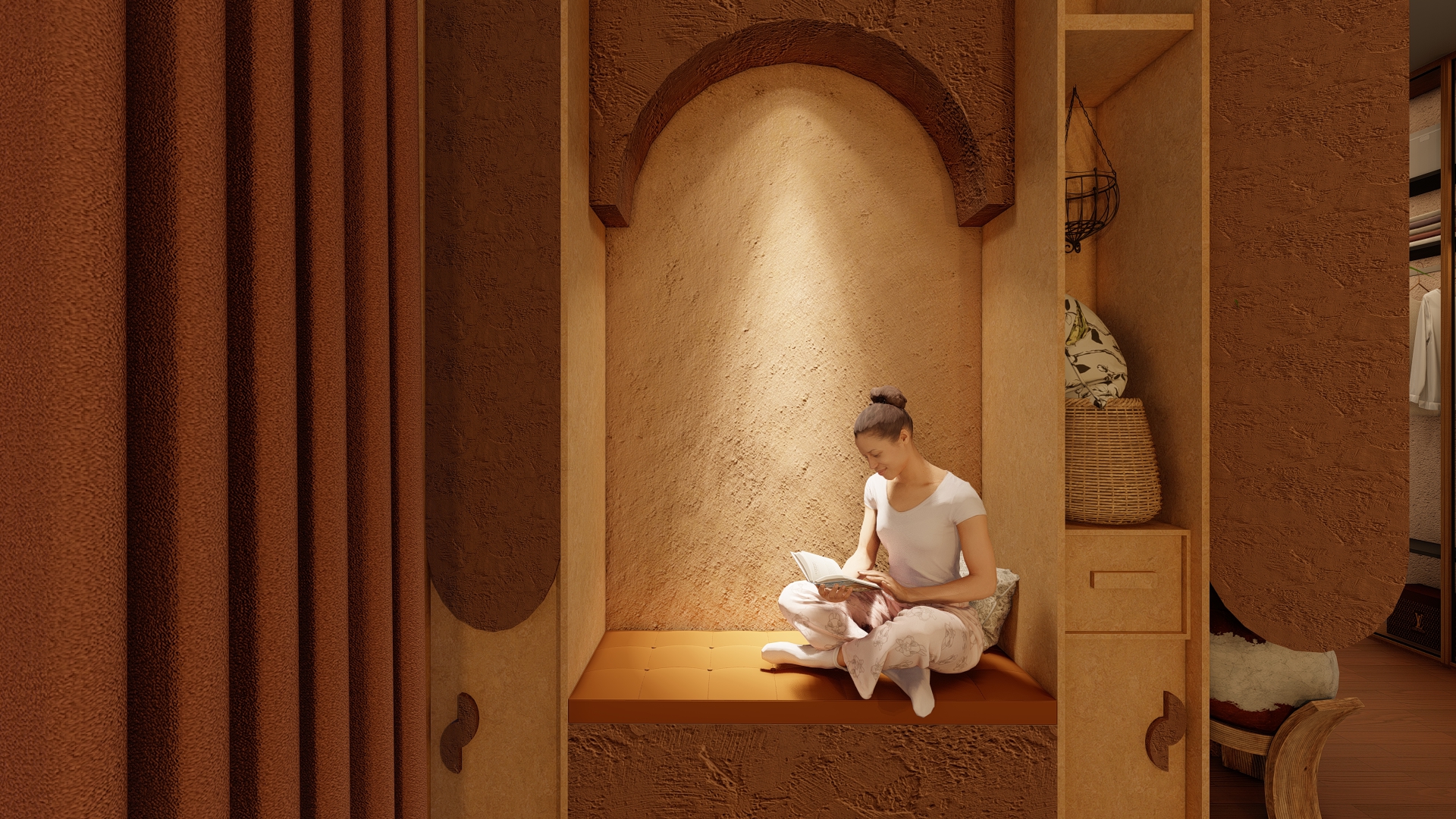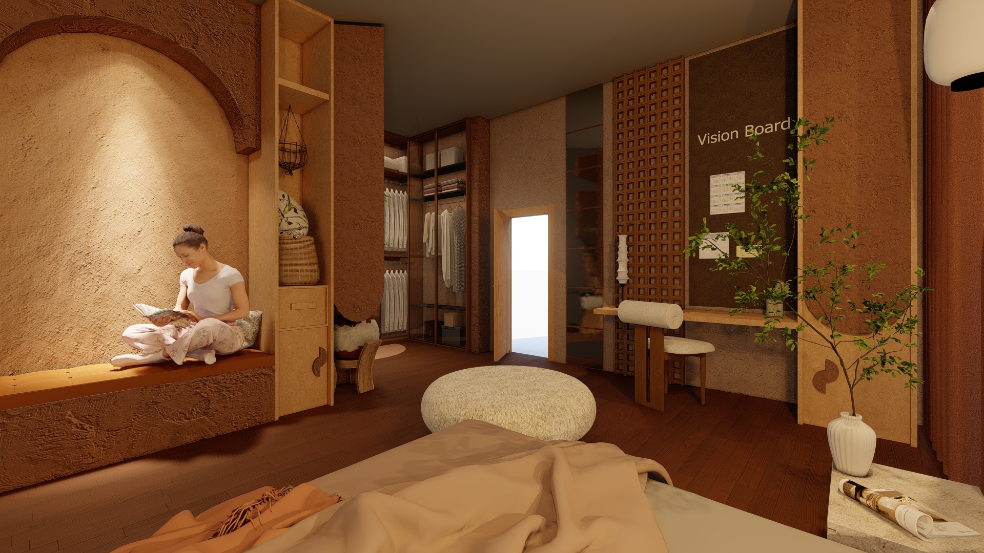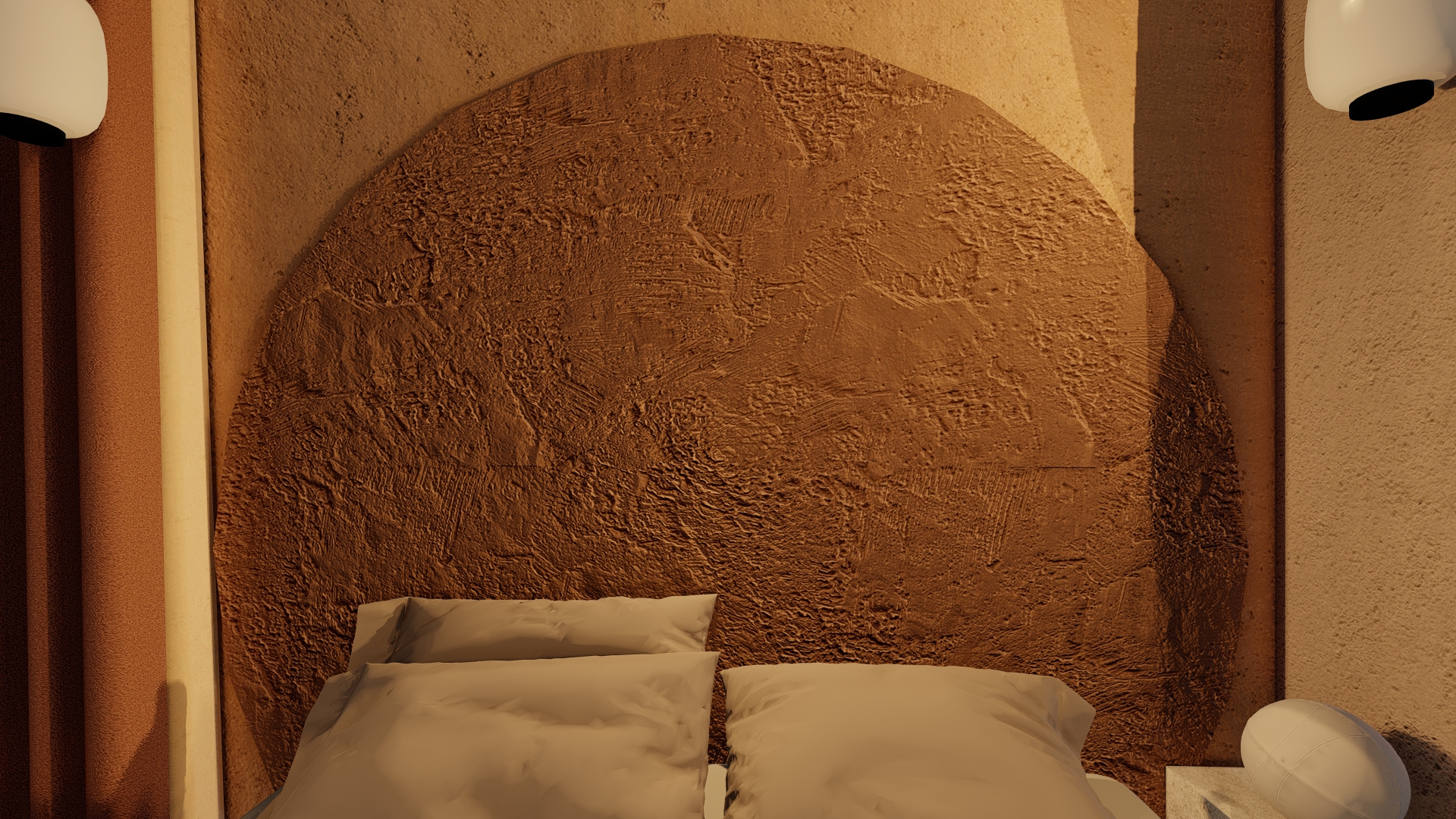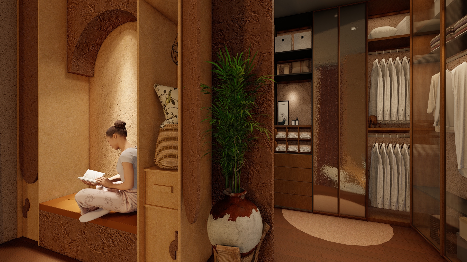 Sunset Reverie is a serene bedroom design that captures the warmth and tranquility of a Mediterranean sunset. Drawing inspiration from the earthy hues of terracotta, this space transforms the bedroom into a cozy sanctuary, blending rustic charm with modern elegance.