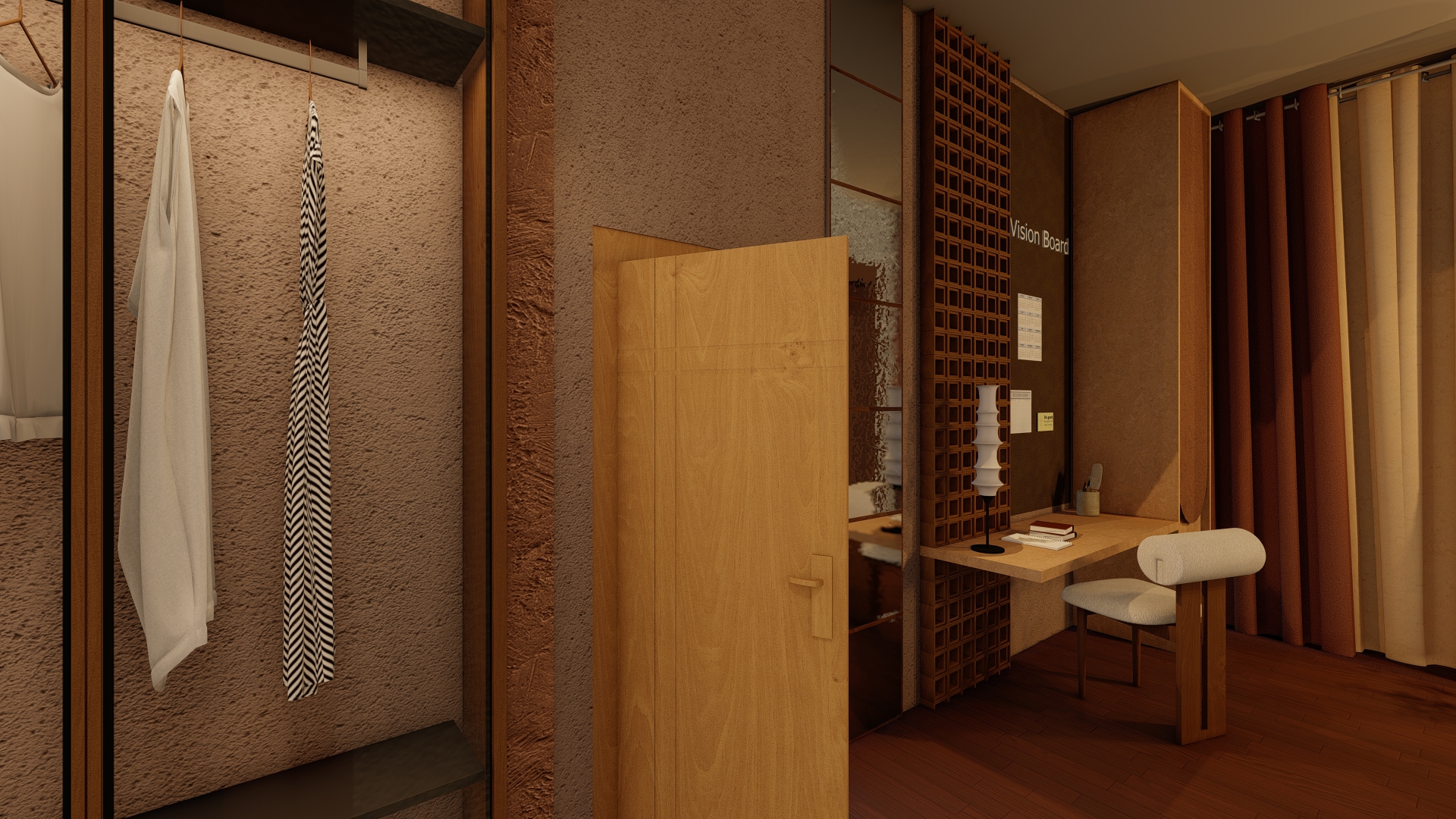 Sunset Reverie is more than just a bedroom; it’s a retreat that invites relaxation and rejuvenation. The thoughtful integration of terracotta tones and natural elements creates a space that is both timeless and contemporary, offering a peaceful haven away from the hustle and bustle of daily life.