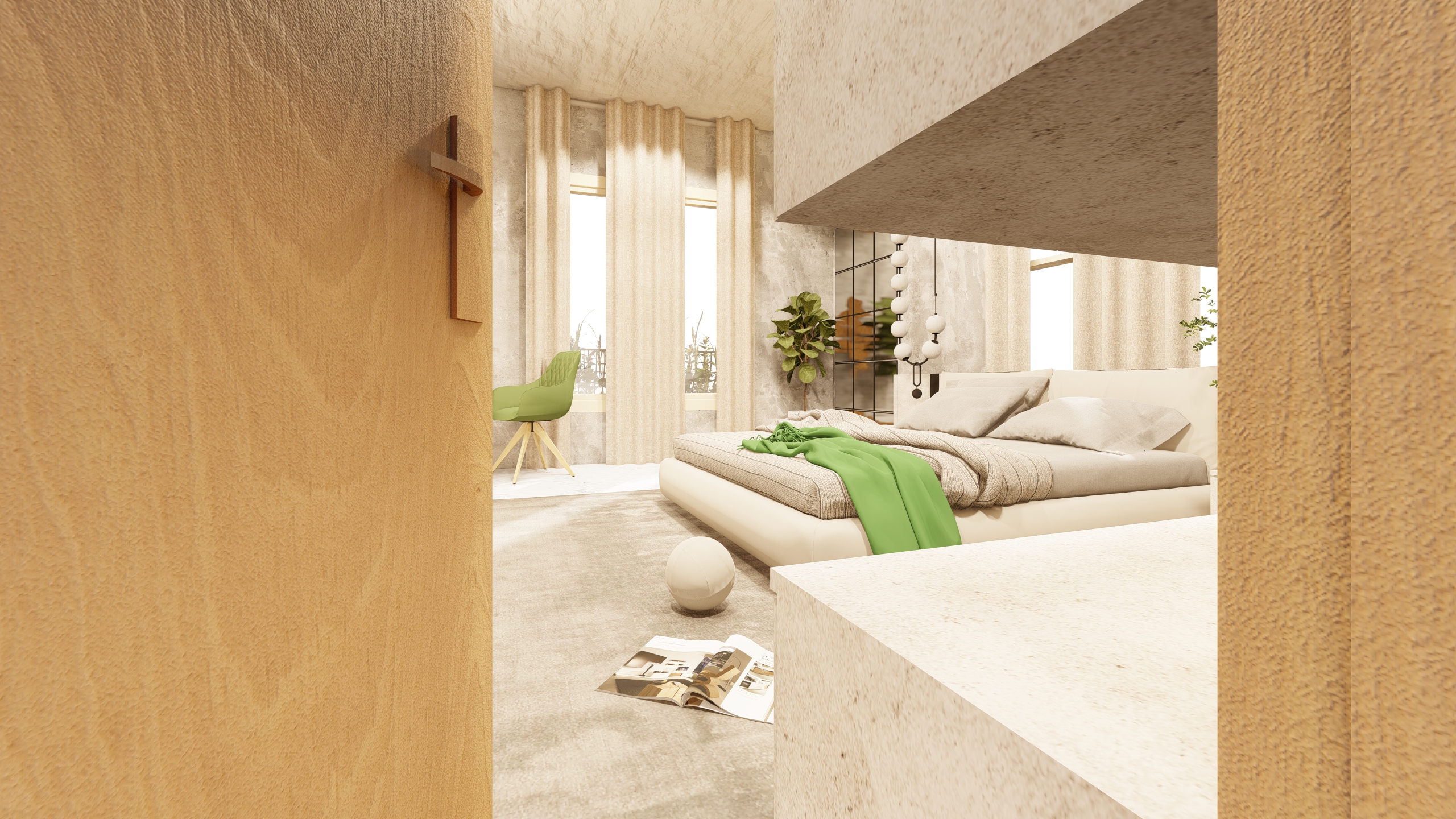 Verdant Haven is a serene bedroom design that seamlessly blends crisp white tones with refreshing green accents, creating a tranquil retreat that celebrates nature. The space is thoughtfully curated to foster relaxation and a deep connection with the natural world.