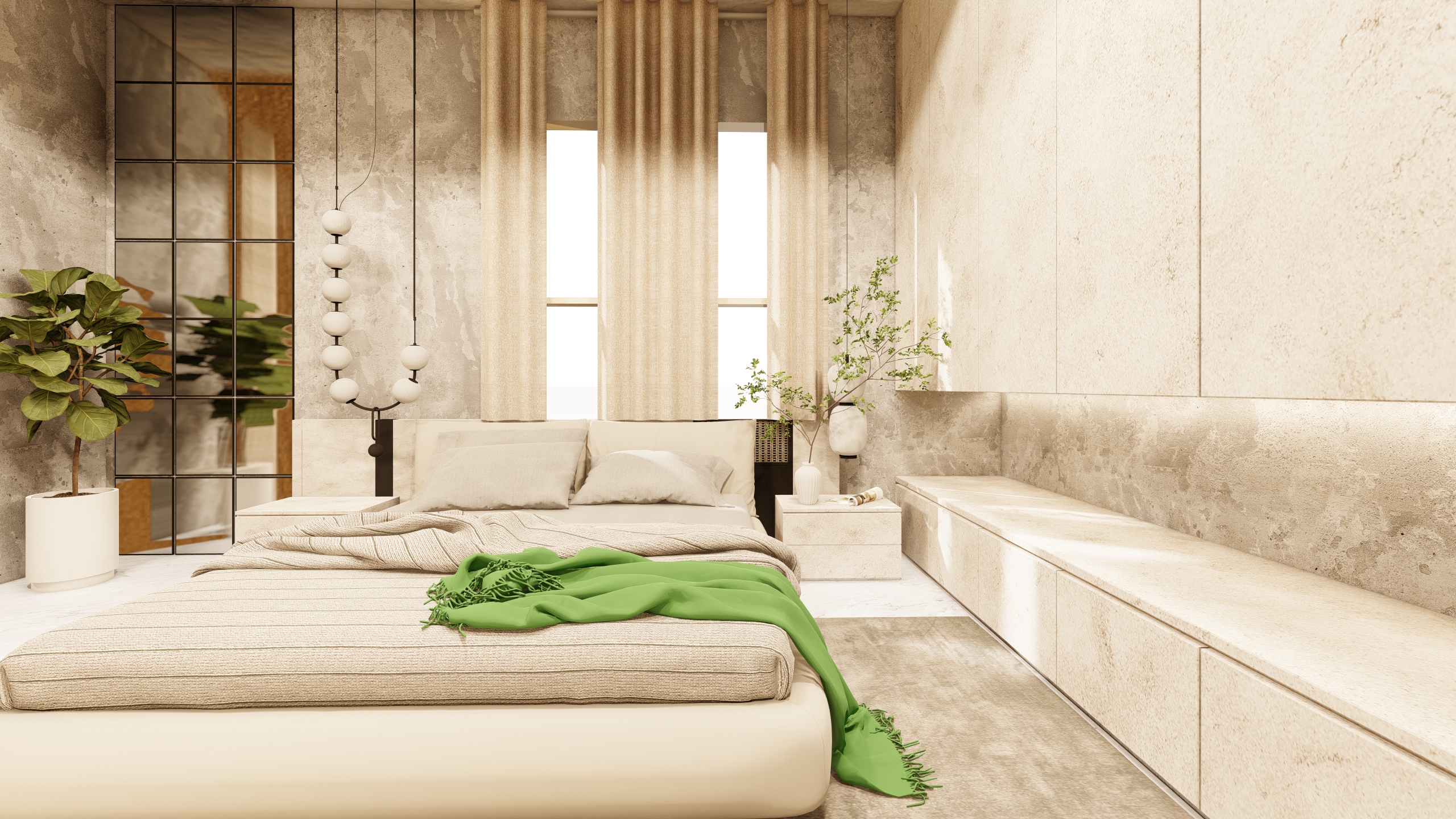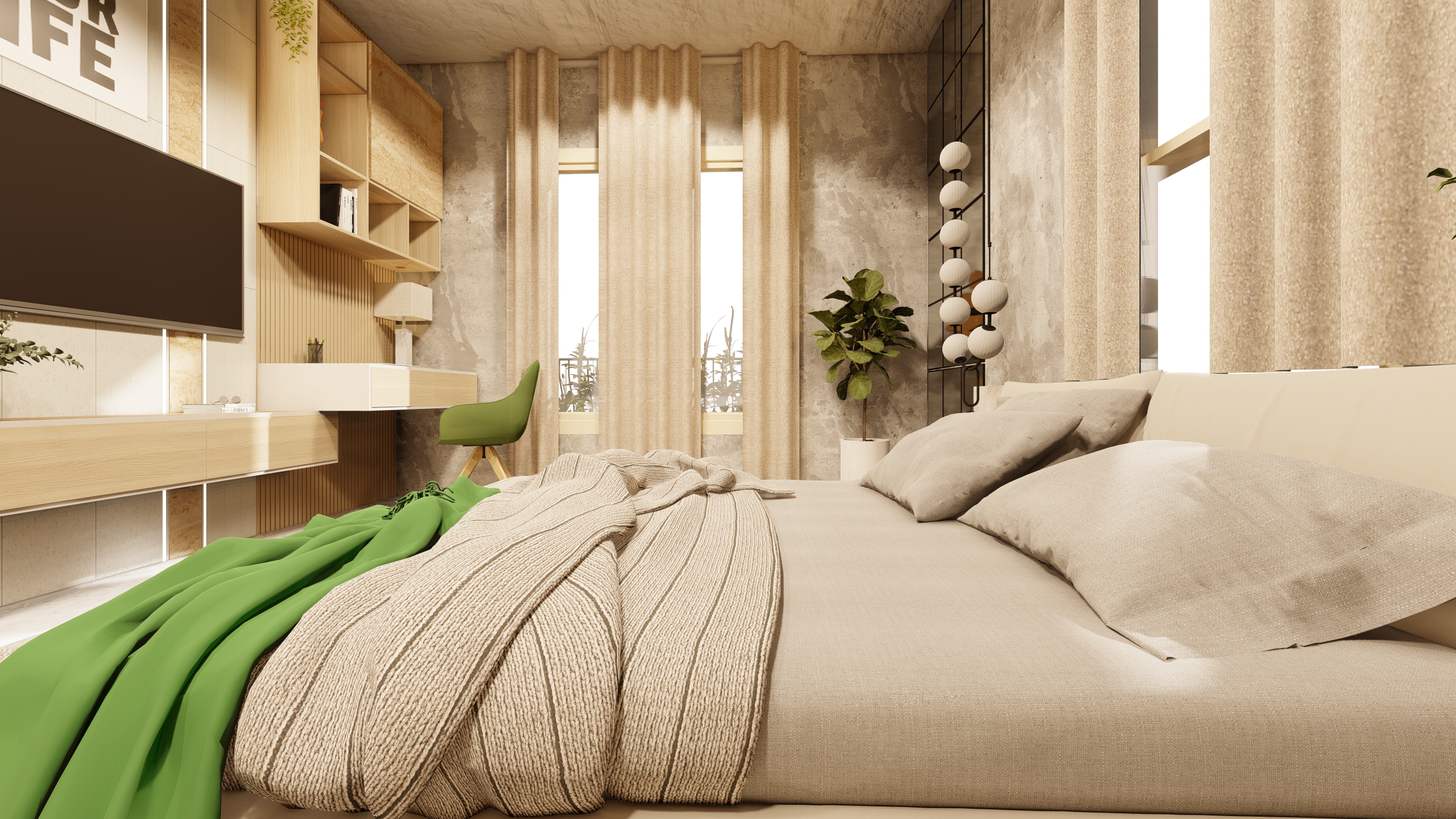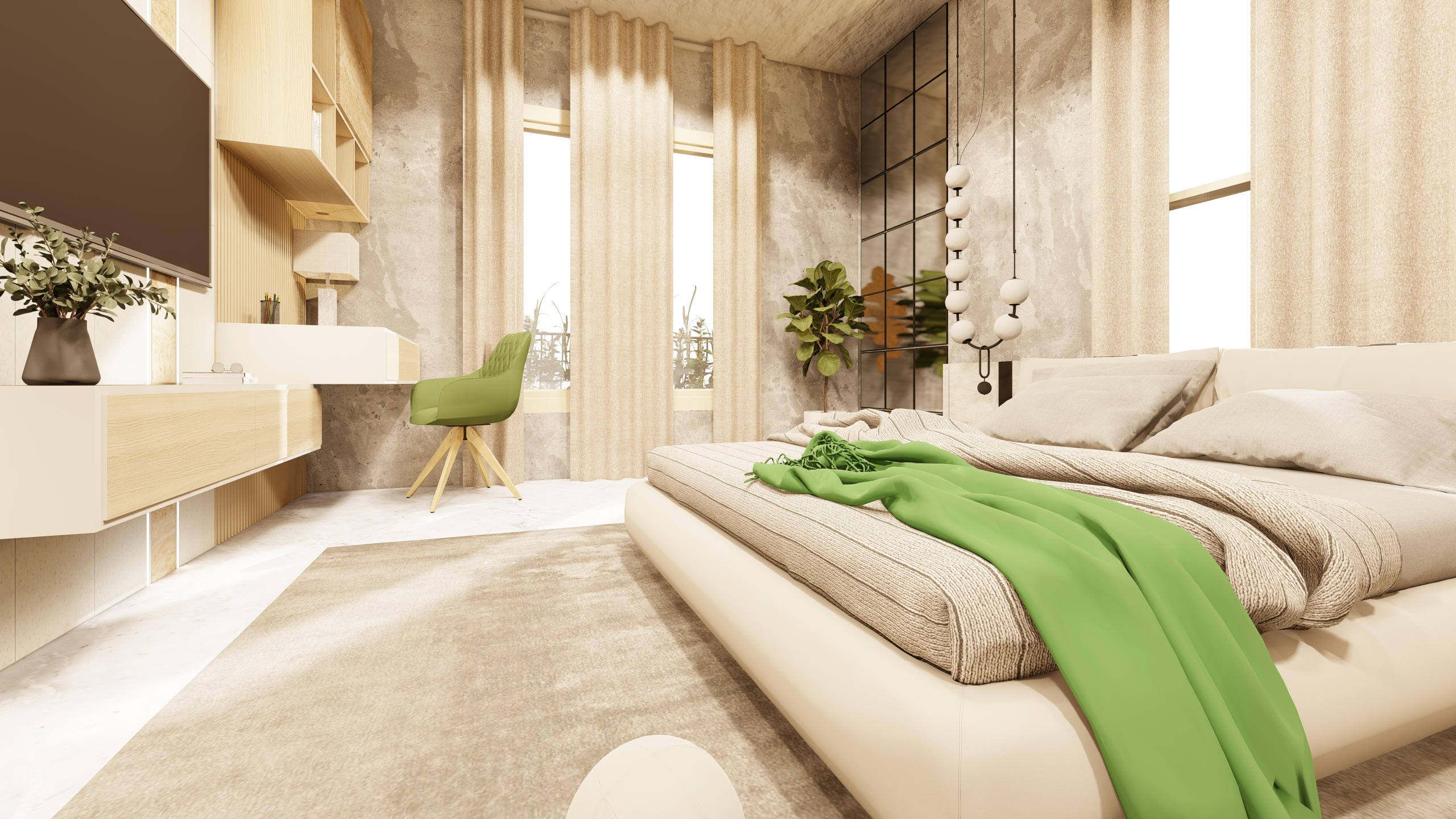 Verdant Haven exemplifies how a balanced combination of white and green, along with thoughtfully selected plants, can transform a bedroom into a peaceful sanctuary. The design promotes well-being and offers a refreshing escape from the hustle and bustle of daily life.