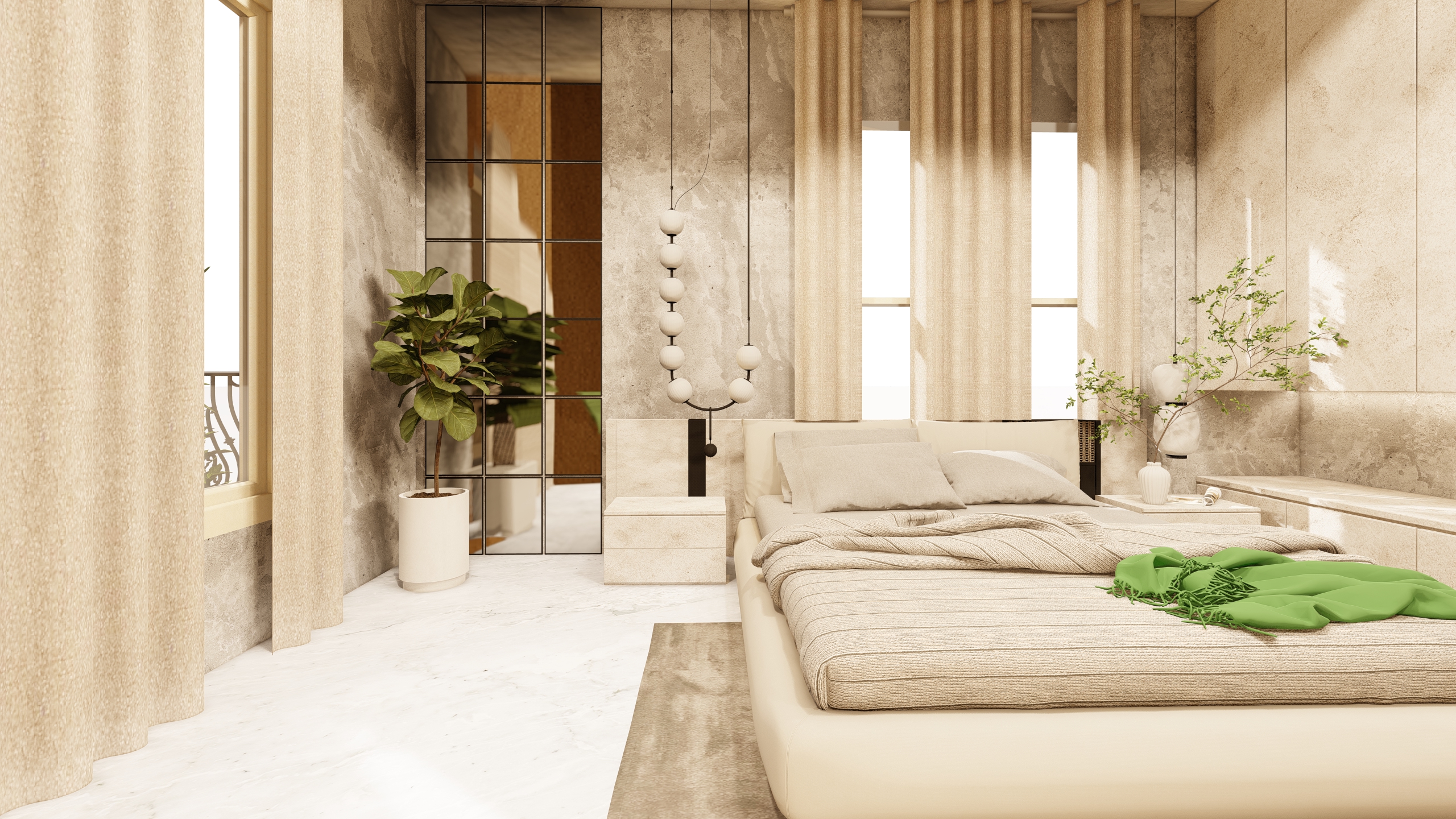 Refreshing Green Accents: Subtle green accents, such as throw pillows and bed linens, introduce a touch of color, evoking the tranquility of nature.