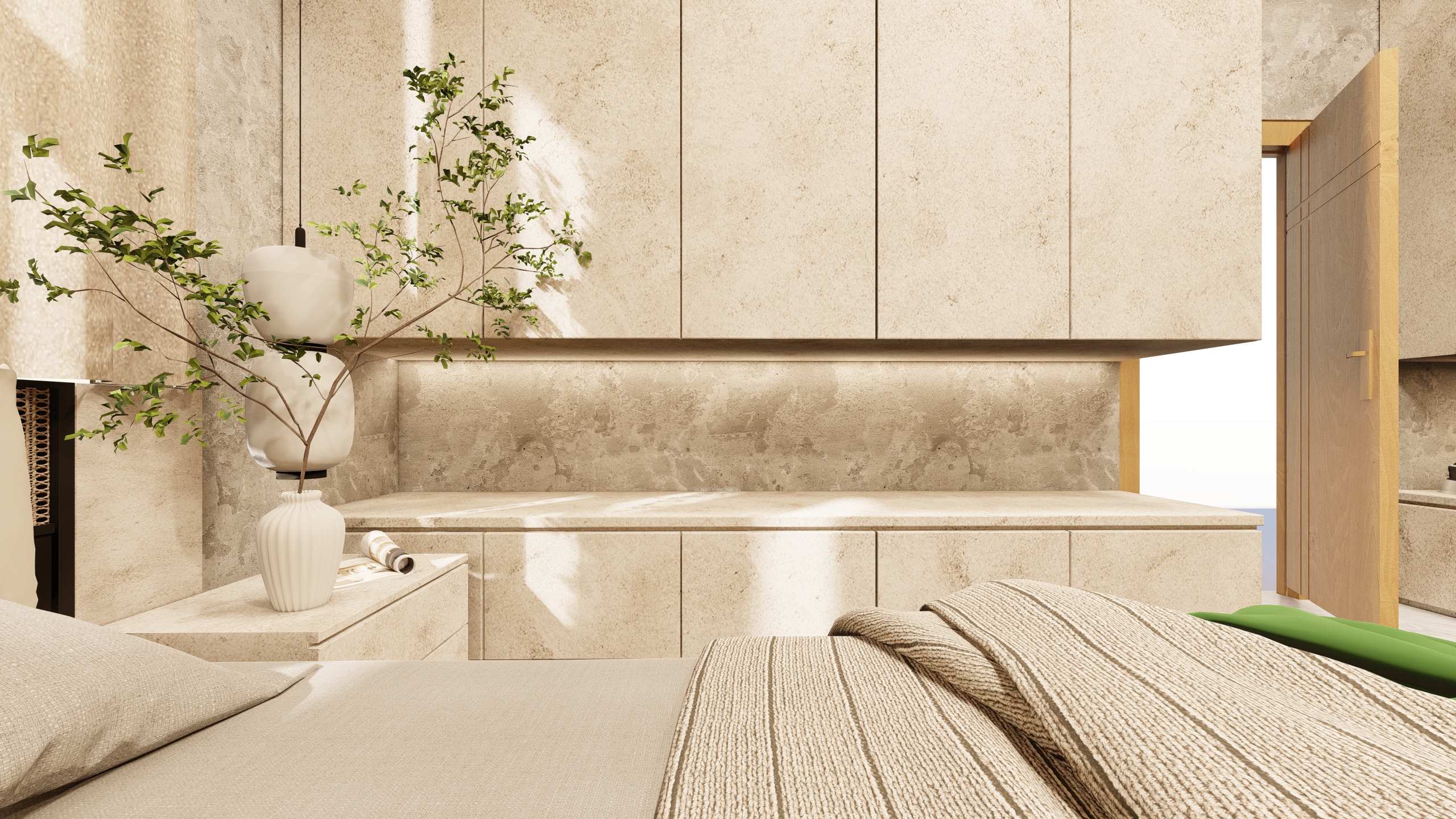 Ambient Lighting: Soft, ambient lighting fixtures are thoughtfully placed to highlight the green accents and create a soothing environment conducive to rest.